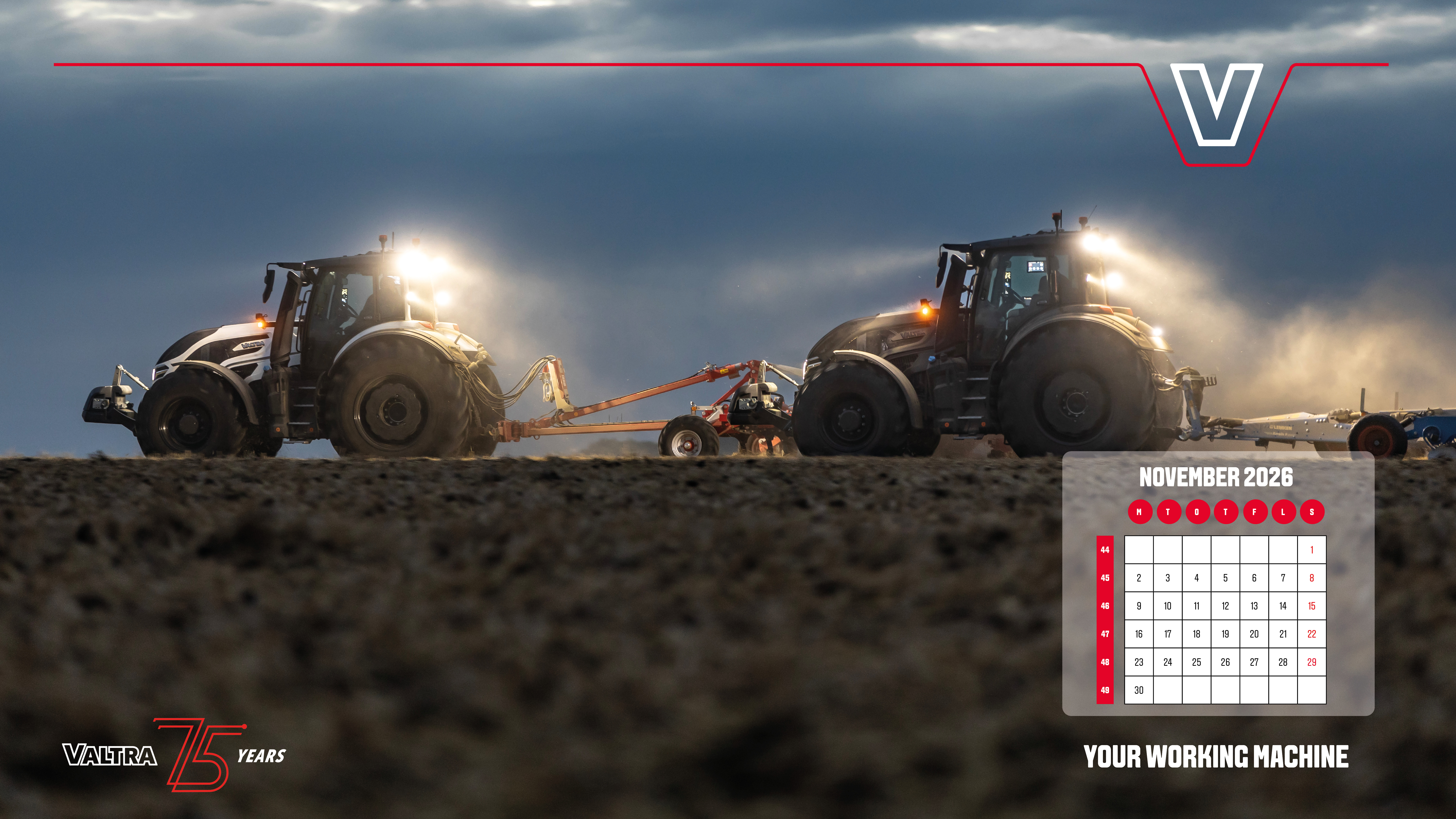 Download vores kalender og få Valtra på din computer, dit hjem eller på kontoret. Klik på billedet for at forstørre, højreklik og tryk 'gem som'. Alternativt kan du downloade alle kalenderne fra downloadlinket.